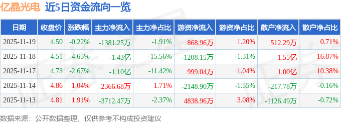 证券之星消息,截至2025年11月19日收盘,亿晶光电(600537)报收于4.5元,下跌0.22%,换手率13.6%,成交量161.02万手,成交额7.22亿元。