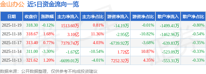 证券之星消息,截至2025年11月19日收盘,金山办公(688111)报收于318.3元,下跌0.12%,换手率1.27%,成交量5.87万手,成交额18.78亿元。