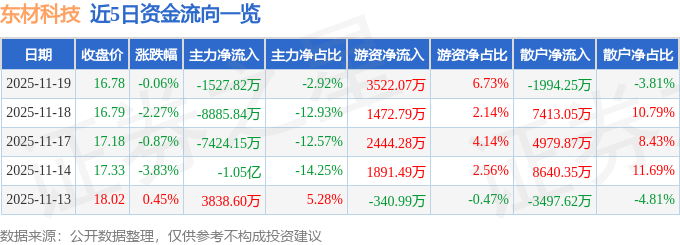 证券之星消息,截至2025年11月19日收盘,东材科技(601208)报收于16.78元,下跌0.06%,换手率3.05%,成交量31.04万手,成交额5.24亿元。