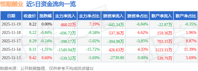 11月19日的资金流向数据方面,主力资金净流入468.22万元,占总成交额7.19%,游资资金净流出445.34万元,占总成交额6.84%,散户资金净流出22.87万元,占总成交额0.35%。