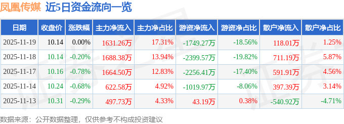 证券之星消息,截至2025年11月19日收盘,凤凰传媒(601928)报收于10.14元,上涨0.0%,换手率0.37%,成交量9.32万手,成交额9424.62万元。