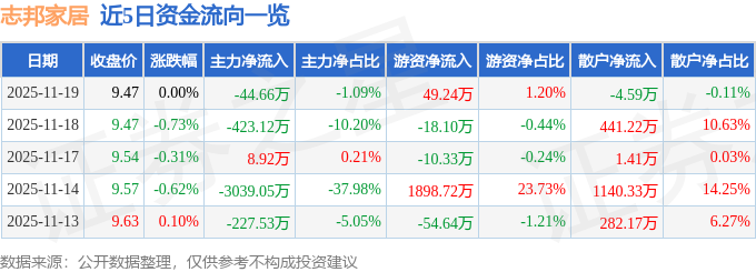证券之星消息,截至2025年11月19日收盘,志邦家居(603801)报收于9.47元,上涨0.0%,换手率1.0%,成交量4.33万手,成交额4096.43万元。