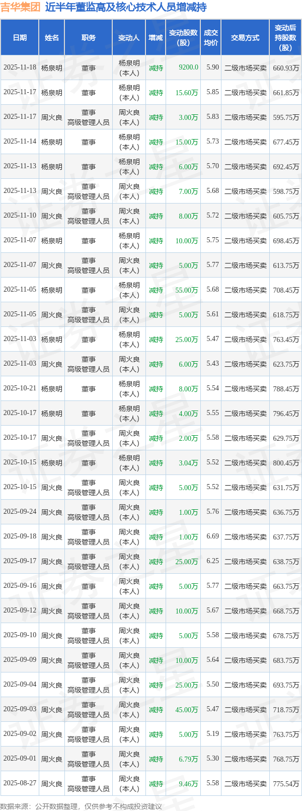 吉华集团近半年内的董监高及核心技术人员增减持详情如下: