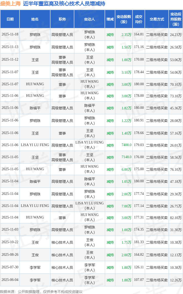 盛美上海近半年内的董监高及核心技术人员增减持详情如下: