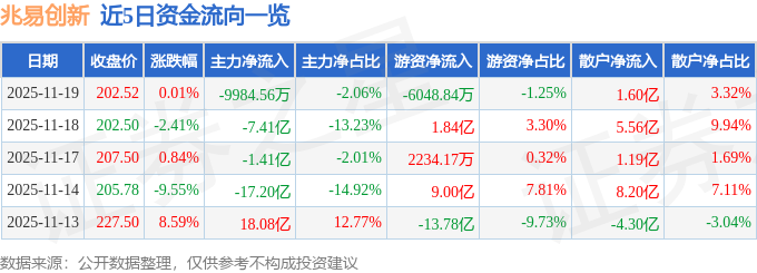 证券之星消息,截至2025年11月19日收盘,兆易创新(603986)报收于202.52元,上涨0.01%,换手率3.58%,成交量23.88万手,成交额48.35亿元。