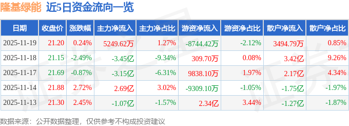证券之星消息,截至2025年11月19日收盘,隆基绿能(601012)报收于21.2元,上涨0.24%,换手率2.59%,成交量196.25万手,成交额41.21亿元。