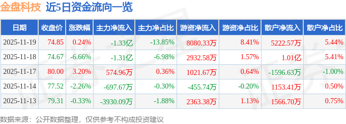 证券之星消息,截至2025年11月19日收盘,金盘科技(688676)报收于74.85元,上涨0.24%,换手率2.78%,成交量12.78万手,成交额9.6亿元。