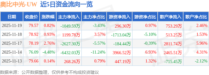 证券之星消息,截至2025年11月19日收盘,奥比中光(688322)报收于79.57元,上涨0.82%,换手率1.32%,成交量3.85万手,成交额3.06亿元。
