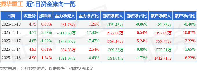 证券之星消息,截至2025年11月19日收盘,振华重工(600320)报收于4.75元,上涨0.85%,换手率1.32%,成交量44.01万手,成交额2.08亿元。