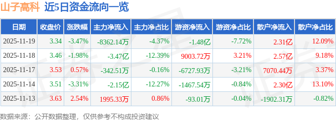 证券之星消息,截至2025年11月19日收盘,山子高科(000981)报收于3.34元,下跌3.47%,换手率6.0%,成交量571.0万手,成交额19.14亿元。