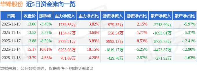 证券之星消息,截至2025年11月19日收盘,华锋股份(002806)报收于13.06元,下跌3.4%,换手率19.26%,成交量33.53万手,成交额4.56亿元。