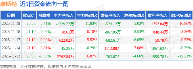 证券之星消息,截至2025年11月19日收盘,康斯特(300445)报收于20.38元,下跌3.41%,换手率3.56%,成交量5.06万手,成交额1.04亿元。