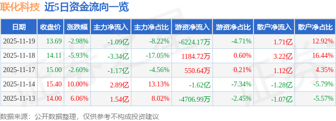 证券之星消息,截至2025年11月19日收盘,联化科技(002250)报收于13.69元,下跌2.98%,换手率10.48%,成交量93.82万手,成交额13.22亿元。