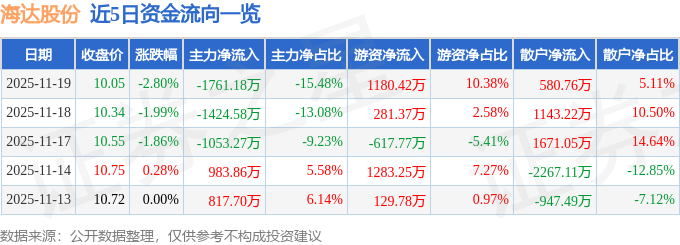 11月19日的资金流向数据方面,主力资金净流出1761.18万元,占总成交额15.48%,游资资金净流入1180.42万元,占总成交额10.38%,散户资金净流入580.76万元,占总成交额5.11%。