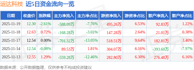 11月19日的资金流向数据方面,主力资金净流出588.09万元,占总成交额7.76%,游资资金净流入495.26万元,占总成交额6.53%,散户资金净流入92.83万元,占总成交额1.22%。