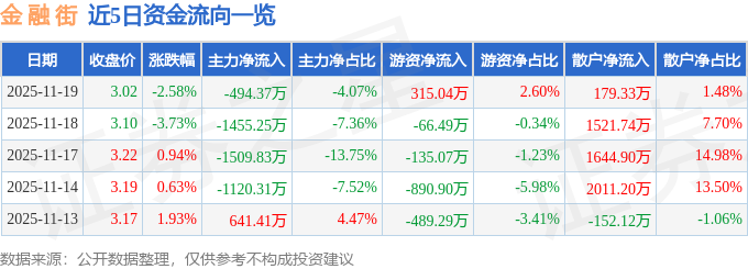 证券之星消息,截至2025年11月19日收盘,金 融 街(000402)报收于3.02元,下跌2.58%,换手率1.34%,成交量39.93万手,成交额1.21亿元。