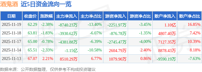 证券之星消息,截至2025年11月19日收盘,酒鬼酒(000799)报收于62.29元,下跌2.38%,换手率3.22%,成交量10.45万手,成交额6.52亿元。