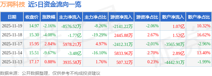 证券之星消息,截至2025年11月19日收盘,万润科技(002654)报收于14.97元,下跌2.16%,换手率8.3%,成交量70.16万手,成交额10.38亿元。
