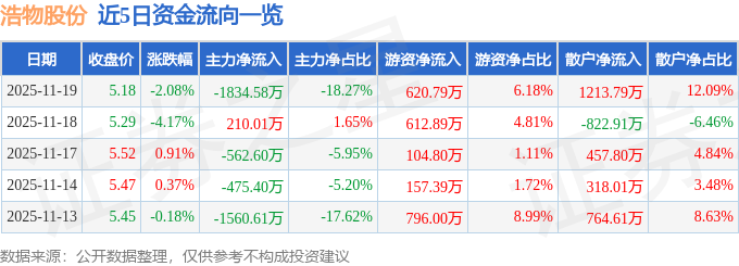 证券之星消息,截至2025年11月19日收盘,浩物股份(000757)报收于5.18元,下跌2.08%,换手率3.63%,成交量19.33万手,成交额1.0亿元。
