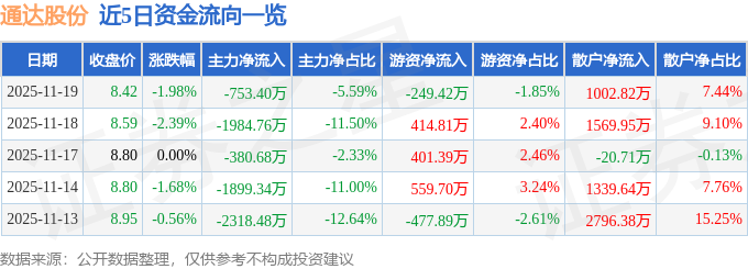 证券之星消息,截至2025年11月19日收盘,通达股份(002560)报收于8.42元,下跌1.98%,换手率3.52%,成交量15.95万手,成交额1.35亿元。