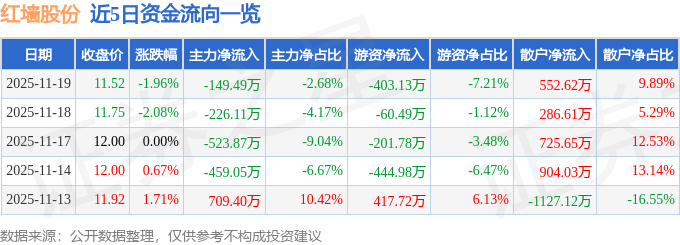 证券之星消息,截至2025年11月19日收盘,红墙股份(002809)报收于11.52元,下跌1.96%,换手率3.47%,成交量4.83万手,成交额5588.02万元。