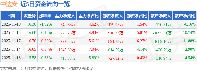 证券之星消息,截至2025年11月19日收盘,中达安(300635)报收于16.36元,下跌1.92%,换手率5.83%,成交量7.01万手,成交额1.17亿元。