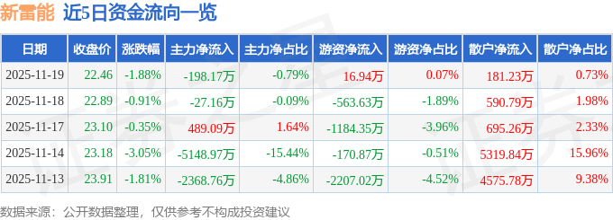 11月19日的资金流向数据方面,主力资金净流出198.17万元,占总成交额0.79%,游资资金净流入16.94万元,占总成交额0.07%,散户资金净流入181.23万元,占总成交额0.73%。