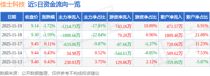 证券之星消息,截至2025年11月19日收盘,佳士科技(300193)报收于9.14元,下跌1.72%,换手率1.77%,成交量7.44万手,成交额6821.39万元。