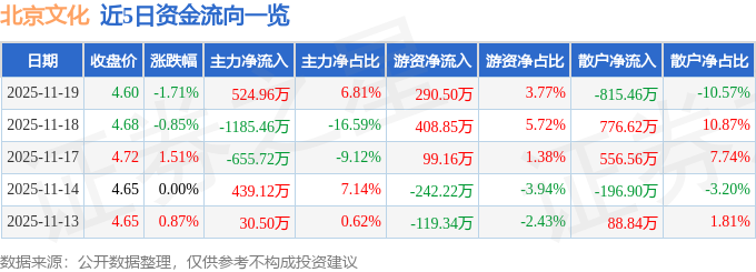 证券之星消息,截至2025年11月19日收盘,北京文化(000802)报收于4.6元,下跌1.71%,换手率2.33%,成交量16.7万手,成交额7711.39万元。