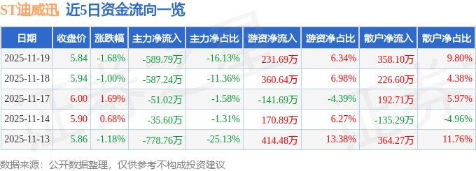 证券之星消息,截至2025年11月19日收盘,ST迪威迅(300167)报收于5.84元,下跌1.68%,换手率1.75%,成交量6.27万手,成交额3655.64万元。
