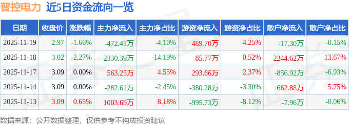 证券之星消息,截至2025年11月19日收盘,晋控电力(000767)报收于2.97元,下跌1.66%,换手率1.33%,成交量38.68万手,成交额1.15亿元。