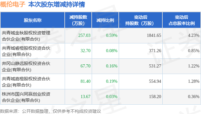证券之星消息,11月19日概伦电子发布公告《概伦电子:关于5%以上股东及其一致行动人权益变动触及1%刻度暨减持股份结果公告》,其股东共青城金秋股权投资管理合伙企业(有限合伙)、共青城睿橙股权投资合伙企业(有限合伙)、株洲市国兴同赢创业投资合伙企业(有限合伙)、井冈山静远股权投资合伙企业(有限合伙)、共青城嘉橙股权投资合伙企业(有限合伙)于2025年11月5日至2025年11月19日间合计减持452.5万股,占公司目前总股本的1.0397%,变动期间该股股价下跌4.4%,截止11月19日收盘报34.73元。