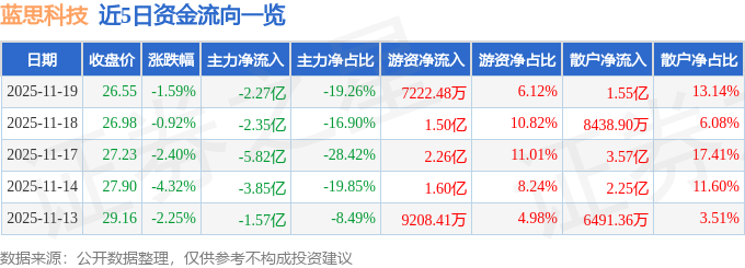 证券之星消息,截至2025年11月19日收盘,蓝思科技(300433)报收于26.55元,下跌1.59%,换手率0.89%,成交量44.26万手,成交额11.81亿元。