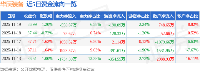 证券之星消息,截至2025年11月19日收盘,华辰装备(300809)报收于36.99元,下跌1.2%,换手率1.52%,成交量2.29万手,成交额8487.06万元。
