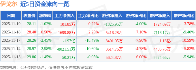 证券之星消息,截至2025年11月19日收盘,伊戈尔(002922)报收于28.11元,下跌1.02%,换手率4.34%,成交量16.29万手,成交额4.56亿元。