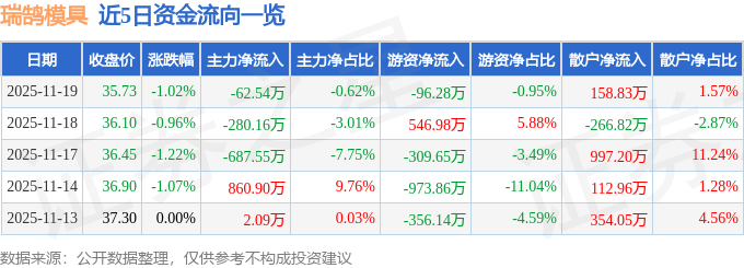 证券之星消息,截至2025年11月19日收盘,瑞鹄模具(002997)报收于35.73元,下跌1.02%,换手率1.35%,成交量2.82万手,成交额1.01亿元。