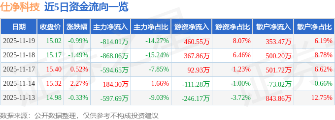 证券之星消息,截至2025年11月19日收盘,仕净科技(301030)报收于15.02元,下跌0.99%,换手率1.88%,成交量3.8万手,成交额5706.19万元。