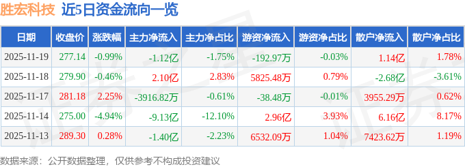 证券之星消息,截至2025年11月19日收盘,胜宏科技(300476)报收于277.14元,下跌0.99%,换手率2.69%,成交量23.03万手,成交额64.3亿元。