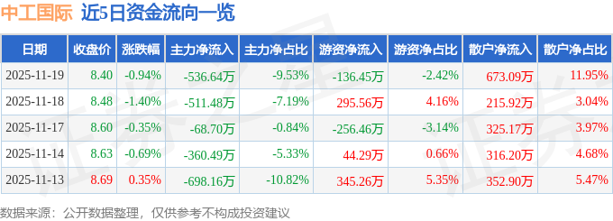 证券之星消息,截至2025年11月19日收盘,中工国际(002051)报收于8.4元,下跌0.94%,换手率0.54%,成交量6.69万手,成交额5630.24万元。