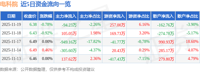 证券之星消息,截至2025年11月19日收盘,电科院(300215)报收于6.38元,下跌0.78%,换手率1.31%,成交量6.53万手,成交额4169.98万元。