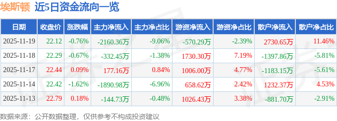 11月19日的资金流向数据方面,主力资金净流出2160.36万元,占总成交额9.06%,游资资金净流出570.29万元,占总成交额2.39%,散户资金净流入2730.65万元,占总成交额11.46%。