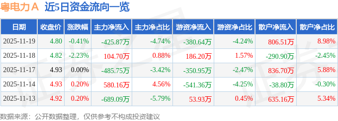 证券之星消息,截至2025年11月19日收盘,粤电力A(000539)报收于4.8元,下跌0.41%,换手率0.73%,成交量18.73万手,成交额8976.78万元。