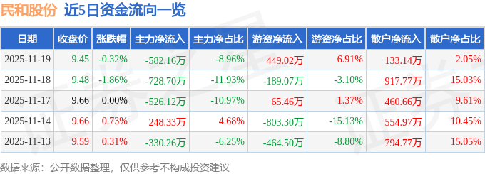 证券之星消息,截至2025年11月19日收盘,民和股份(002234)报收于9.45元,下跌0.32%,换手率2.29%,成交量6.91万手,成交额6499.82万元。