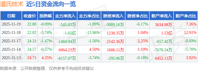 证券之星消息,截至2025年11月19日收盘,道氏技术(300409)报收于22.8元,下跌0.09%,换手率3.18%,成交量21.86万手,成交额5.01亿元。