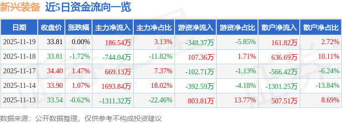证券之星消息,截至2025年11月19日收盘,新兴装备(002933)报收于33.81元,上涨0.0%,换手率1.54%,成交量1.76万手,成交额5951.62万元。