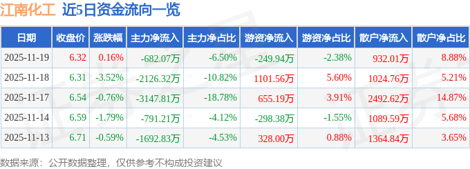 证券之星消息,截至2025年11月19日收盘,江南化工(002226)报收于6.32元,上涨0.16%,换手率0.63%,成交量16.6万手,成交额1.05亿元。