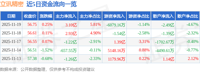 证券之星消息,截至2025年11月19日收盘,立讯精密(002475)报收于56.75元,上涨0.25%,换手率1.29%,成交量93.53万手,成交额53.31亿元。