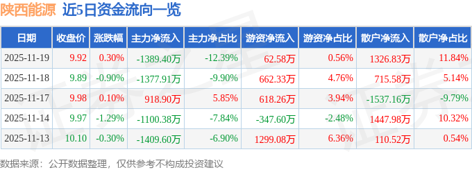 证券之星消息,截至2025年11月19日收盘,陕西能源(001286)报收于9.92元,上涨0.3%,换手率1.08%,成交量11.3万手,成交额1.12亿元。