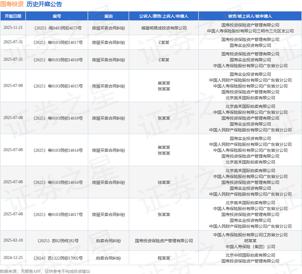 根据统计,近一年内以国寿投资保险资产管理有限公司为当事人的历史开庭公告有10则,其中案由为“房屋买卖合同纠纷”的公告以8则居首,其次为“拍卖合同纠纷”有2则。历史开庭公告如下: