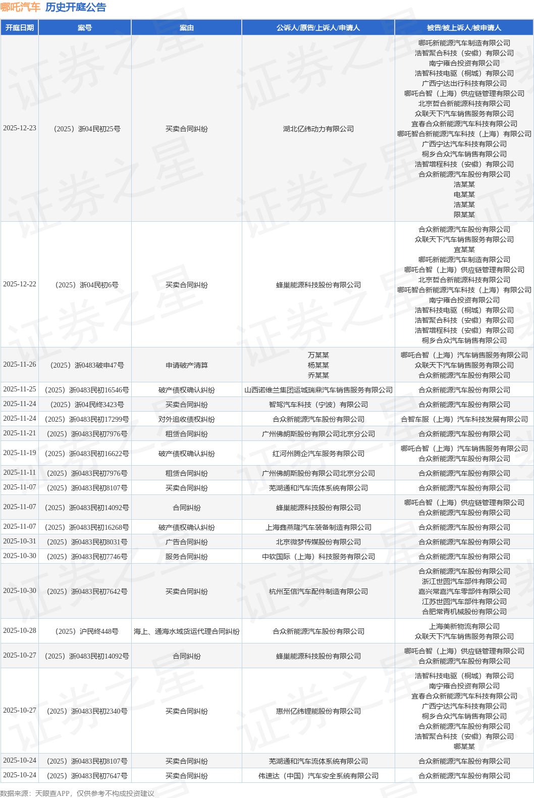 案号:(2025)浙0483民初7976号根据统计,近一年内以合众新能源汽车股份有限公司为当事人的历史开庭公告有401则,其中案由为“买卖合同纠纷”的公告以160则居首,其次为“服务合同纠纷”有51则,“合同纠纷”有49则。历史开庭公告(前20条)如下: